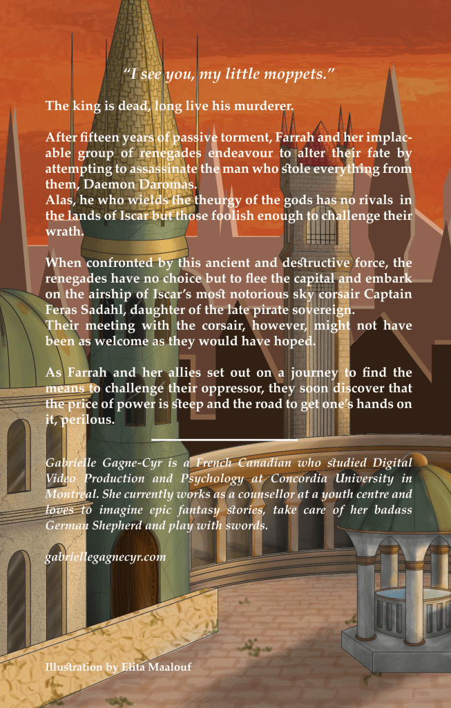 While I tend to leave authors out of reviews (it’s the art that I am reviewing, not the artist), when Gabrielle Gagne-Cyr reached out to me about writing a review for The Theurgy of the Gods: A Flight in the Heavens (of which I will simply refer to by the shorter title, A Flight in the Heavens from here on out), I was struck by her energy. I hoped that some of this energy would make its way into the book. From the outset, before chapter one, there is a great brief note about how the novel is written in Canadian English, which brings this personality to the fore, and I hope it makes it into the final version. Moving into chapter one, I was not disappointed: Cagne-Cyr’s energy is throughout the book, providing an author voice that brings a freewheeling attitude to the novel, from start to finish.