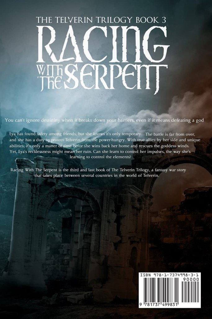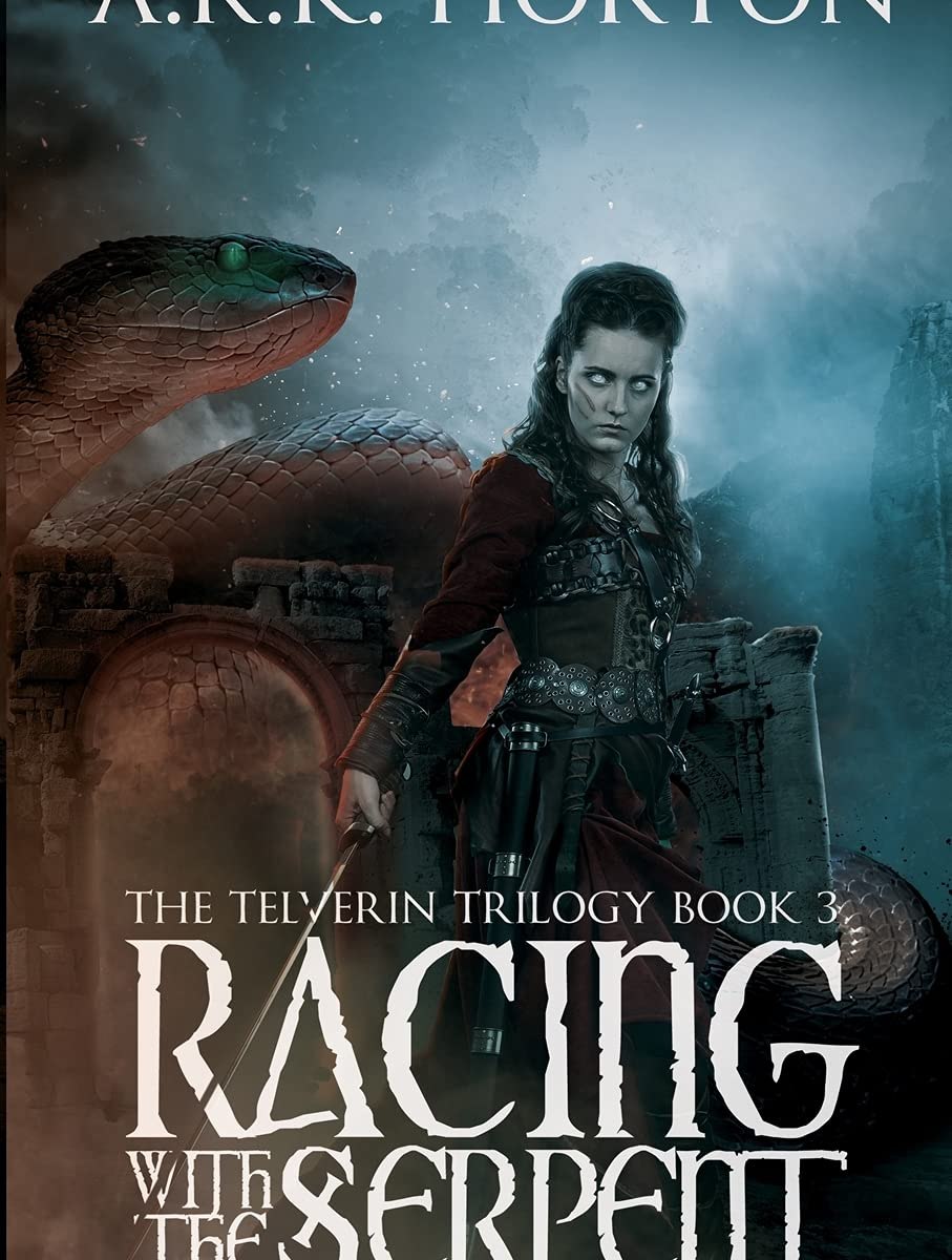 While I don’t generally comment on covers in my reviews (it’s what’s on the inside that counts), I’m going to make a point of it this time. The third part of A.R.K. Horton’s The Telverin Trilogy, following Struggling With the Current and Flirting With the Tempest (click those links for my thoughts about them) features a cover where the protagonist of these stories, Eya, has evolved: no longer the passive girl in Struggling With the Current, and knowing more about herself than Flirting With the Tempest, the cover to Racing With the Serpent offers a more mature, darker vision of Eya. This sits perfectly with the themes of the novel and Eya’s growth as a character throughout this trilogy.