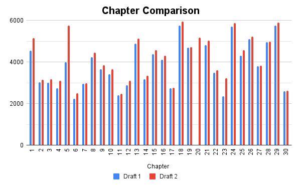 The word count growing is something that has happened with every chapter. In the previous post, I mentioned how much the initial chapters grew by, and I have included these below again, along with Chapters 15 to 20: