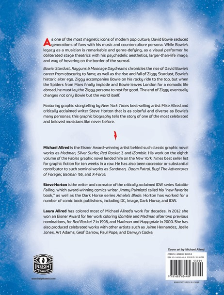 To get this out of the way, my review of Bowie: Stardust, Rayguns & Moonage Daydreams (henceforth referred to as simply Bowie, despite its beautiful subtitle) is a little different from my usual fare. It is not an independent book that I am reviewing to bring (admittedly limited) attention to—while it is indeed published by an independent publisher, Insight Comics, writer/artist Mike Allred, writer Steve Horton, and colourist Laura Allred don’t need me to bring attention to their work. Neil Gaiman, who wrote the foreword might, because nobody’s heard of him, have they? But as much as Gaiman would appreciate my help, this is already a New York Times bestseller.