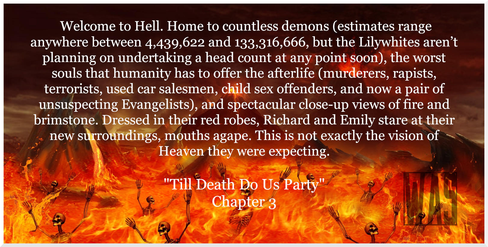 So with that in mind, here are December’s Saturday Snippets. Please note that these snippets are not representative of any final product. They are a work in progress, taken from Till Death Do Us Party, draft 2.1. Ergo, they might not make it to the final product, and if they do, they will likely be at least somewhat different from their current form.