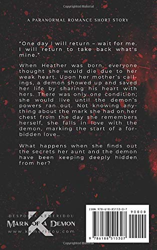Mark of a Demon tells the story of Heather, a girl whose mother, upon her birth, made a deal with the demon the Naberius to save her life, sacrificing her own in the process. The story covers Heather’s life, up until the point when she and Naberius embark on a love affair. Throughout its 90 pages in paperback, or an estimated 50 pages on Kindle (I read this on Kindle, and it certainly felt more like 50 pages than 90), Kemeridou builds the story carefully, crafting a slow burn tale about this girl, who has always been different, given the secret of her existence.