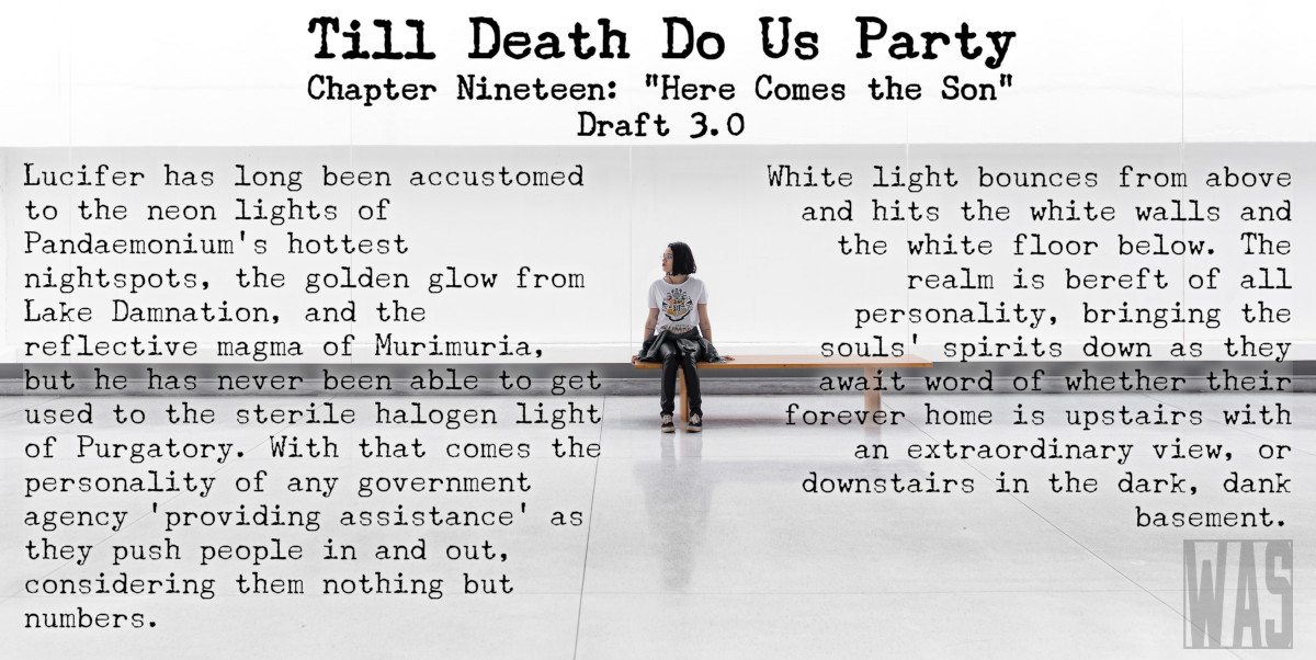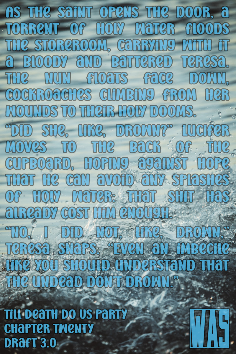 As always, please note that the snippets from Till Death Do Us Party are not representative of any final product; they are a work in progress, with all of these coming from draft three. These may or may not make it to the final product, and if they do, who knows how their final form will look. So just consider these as glimpses into the drafting process.