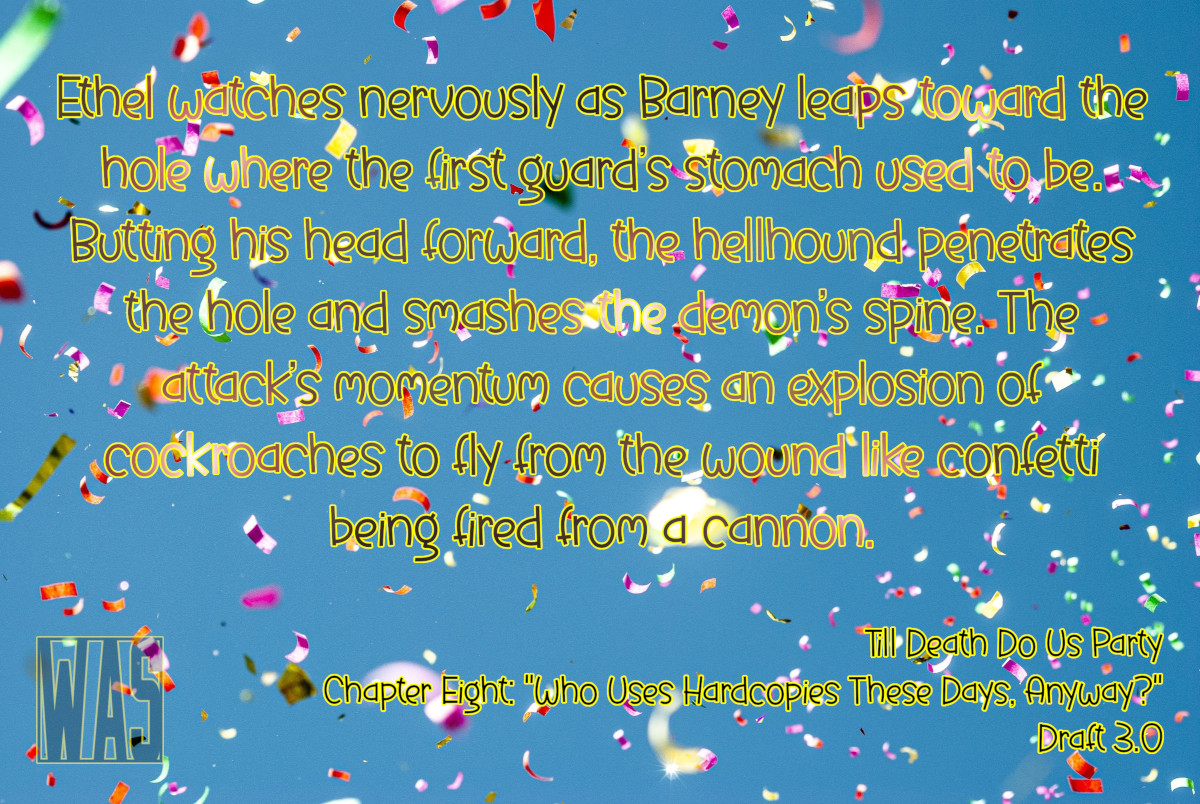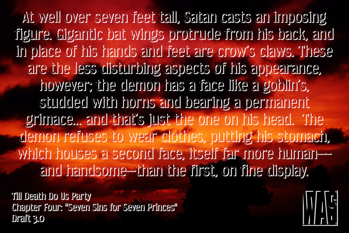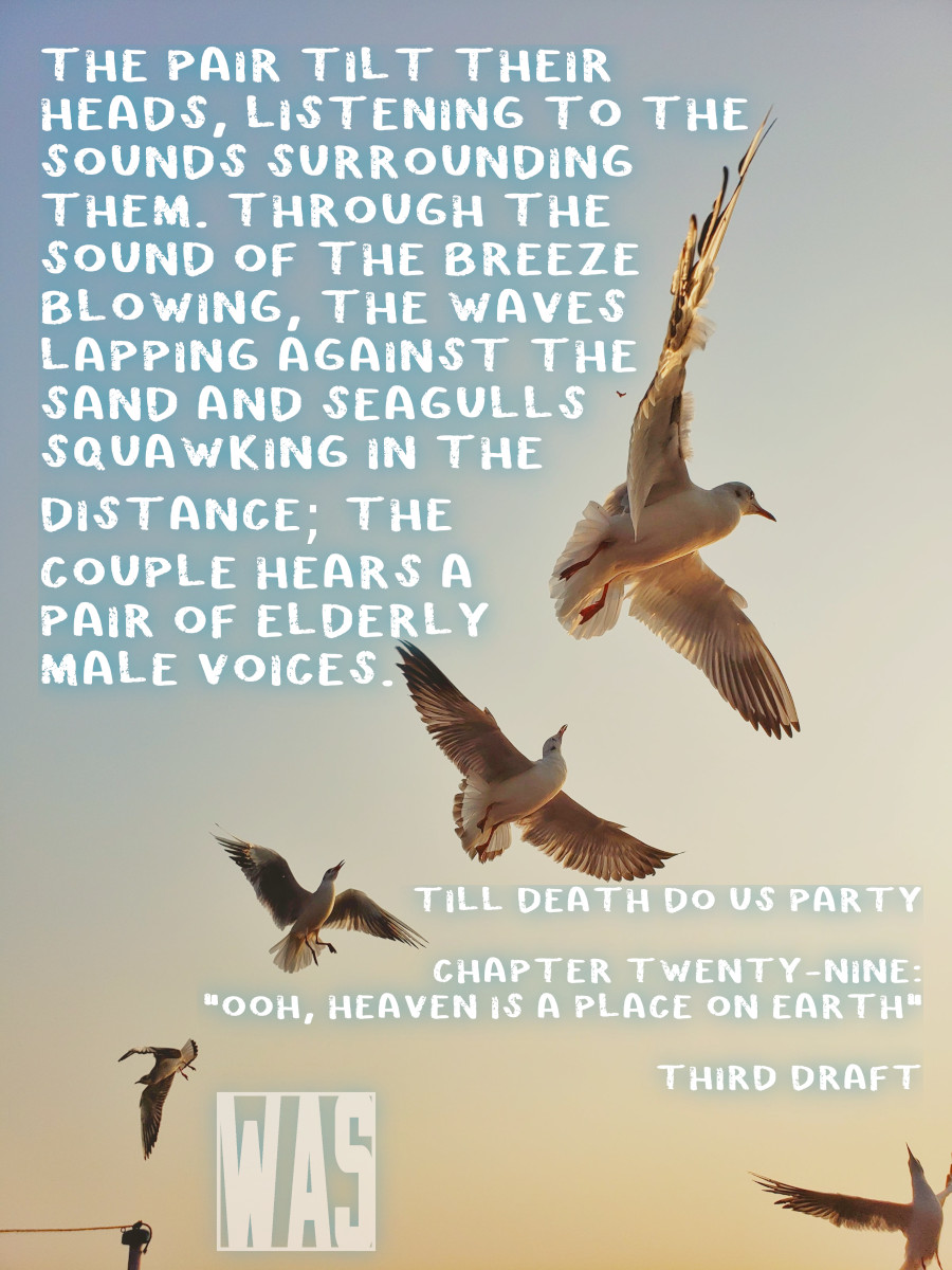 As always, please note that the snippets from Till Death Do Us Party are not representative of any final product; they are a work in progress, with all of these coming from draft three. These may or may not make it to the final product, and if they do, who knows how their final form will look. So just consider these as glimpses into the drafting process.