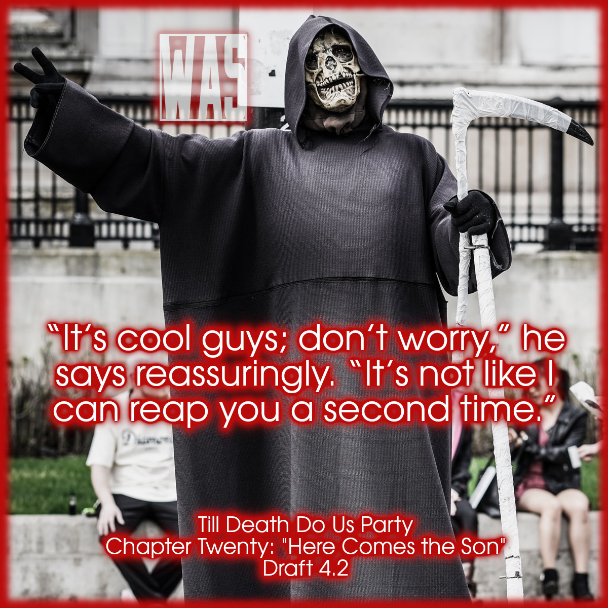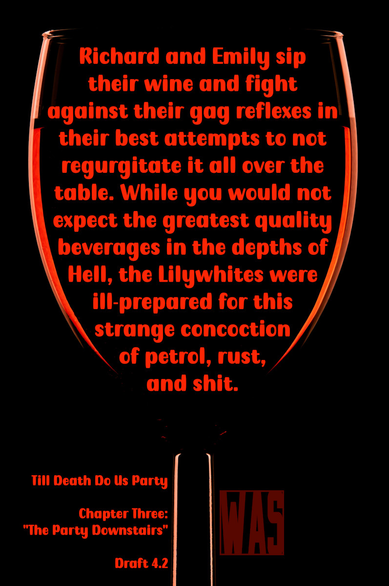 If you don’t know the drill, it’s time to look back at Saturday Snippets from July, taken from Till Death Do Us Party, draft 4.2. Enjoy them while you can, because from next month until some nebulous point in the future, these Saturday Snippets will be coming from Luminary. At least making progress on the next draft of that is good for something, right?
