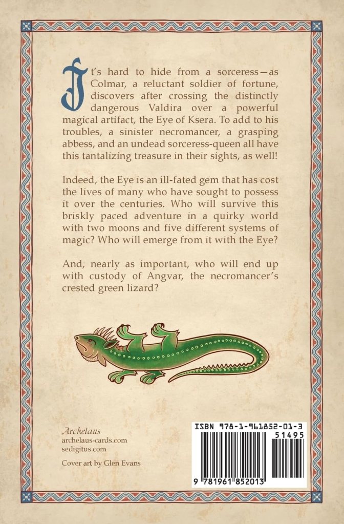 At 184 pages in paperback (or an estimated 166 pages in eBook), The Eye of Ksera is a brief read that can easily be digested in a single sitting. Broken into four parts, it tells the story of protagonist Colmar, on the run from a sorceress wishing to reclaim a magical artefact, the titular Eye of Ksera. The story moves at a brisk pace as it tells an entertaining story throughout its four parts. The plot works well, building nicely as it moves towards its conclusion. While the plot isn’t intricate, it serves the novella well. It features the right amount of story for the format, without padding a shorter story out, or cramming too much in.
